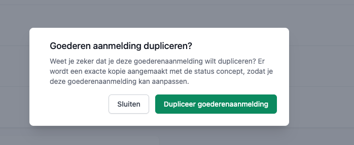 - Er verschijnt een pop-up met de vraag of je zeker weet dat je de aanmelding wilt dupliceren. Klik op Dupliceer goederenaanmelding om te bevestigen. De gedupliceerde aanmelding wordt direct toegevoegd aan het overzicht. Achter de naam van de goederenaanmelding wordt automatisch (kopie) geplaatst.