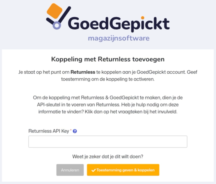 - Je wordt automatisch doorgestuurd naar GoedGepickt, waar je de API key die je bij stap 3 hebt aangemaakt invult. Kies vervolgens voor Toestemming geven & koppelen.