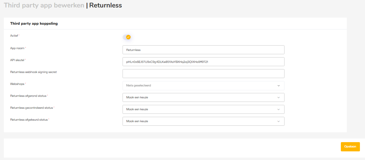 - In GoedGepickt kun je via Instellingen > Third Party Apps > Returnless zelf instellen welke statussen je kiest om afgeronde, gecontroleerde en afgekeurde statussen door te geven aan Returnless.