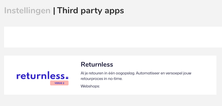 - Open GoedGepickt en navigeer naar Instellingen -> Third Party Apps -> Hier zie je dat er een nieuwe Returnless koppeling is toegevoegd.
