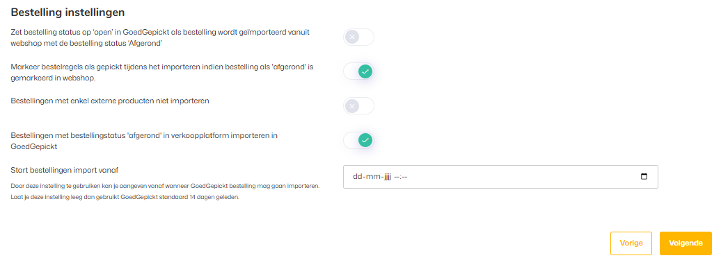 In deze handleiding leggen we uit hoe je tijdens het maken van een webshopkoppeling kunt aangeven dat je bestellingen vanaf een specifieke datum wilt importeren. Wanneer je dit instelt, zullen er geen bestellingen in GoedGepickt worden geïmporteerd tot de ingestelde datum en tijd verstreken is.