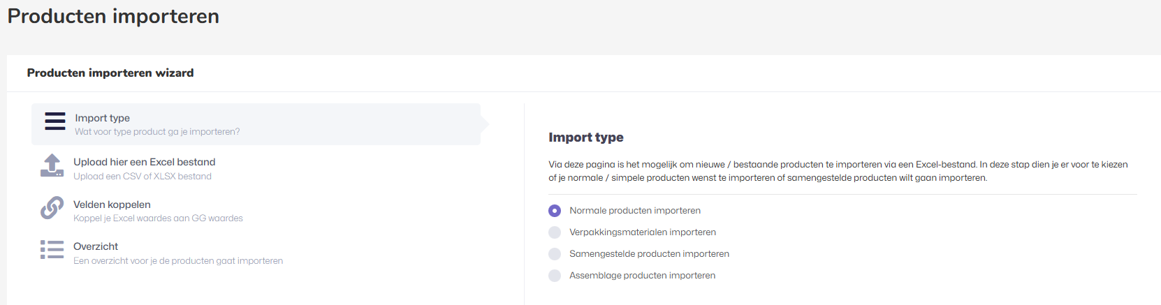 Je kiest hier wat voor soort producten je wil importeren. Importeer je normale, verpakkingsmaterialen, samengestelde producten of assemblage producten? Nadat je het juiste import type hebt gekozen, klik je op volgende.