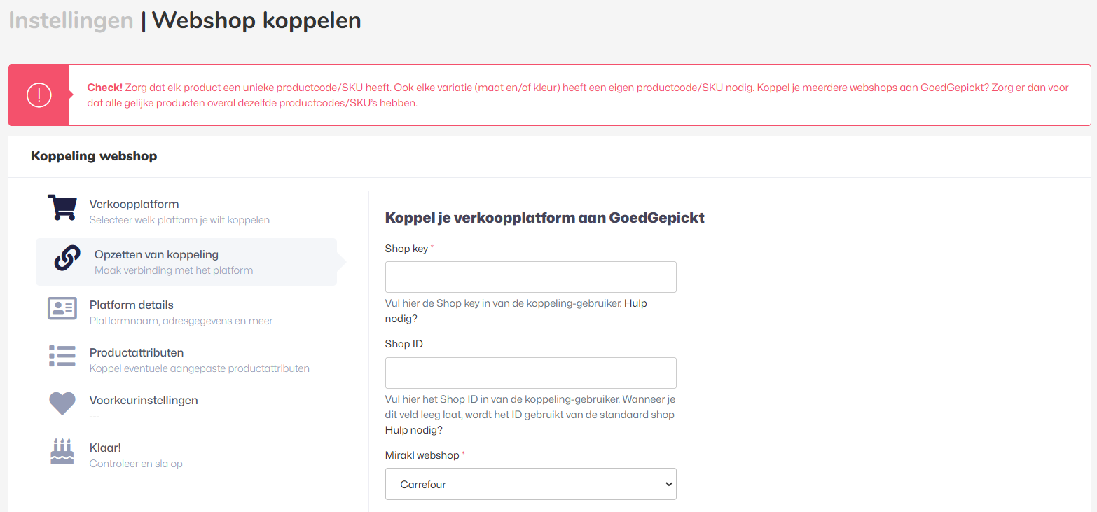 In deze handleiding leggen we uit hoe je een koppeling opzet tussen Carrefour (via Mirakl) & GoedGepickt. De koppeling zorgt er voor dat je bestellingen automatisch worden geïmporteerd, zonder dat je er handmatig iets voor hoeft te doen. We zorgen daarbij ook dat je voorraad altijd up to date blijft.