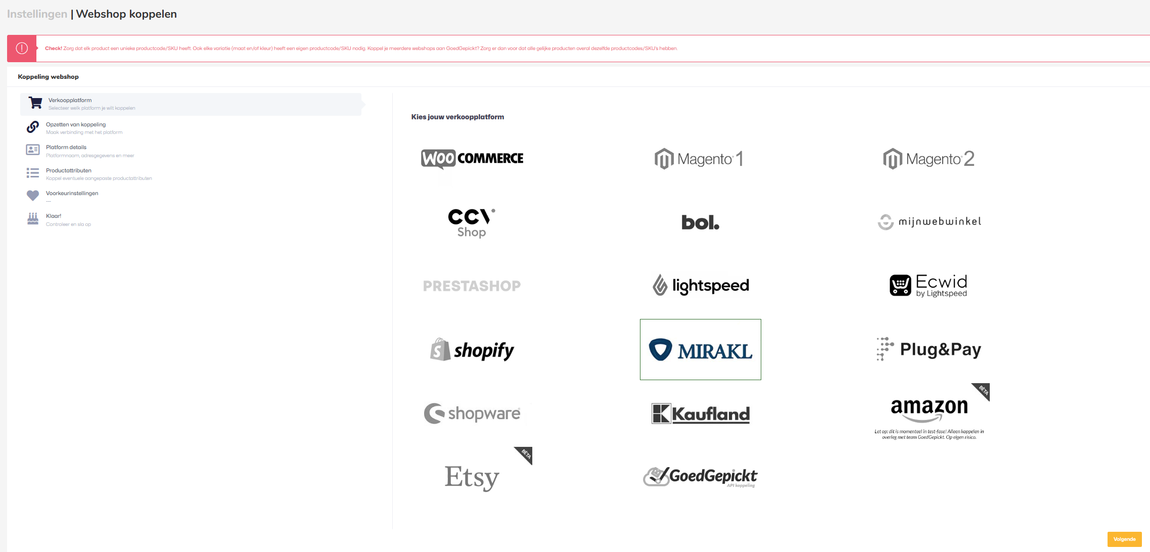 - Wanneer je de benodigde gegevens hebt verzameld, ga je in GoedGepickt naar Instellingen > Webshops > Klik rechts in het scherm op + Koppel webshop > klik op Mirakl. Klik hierna op Volgende.