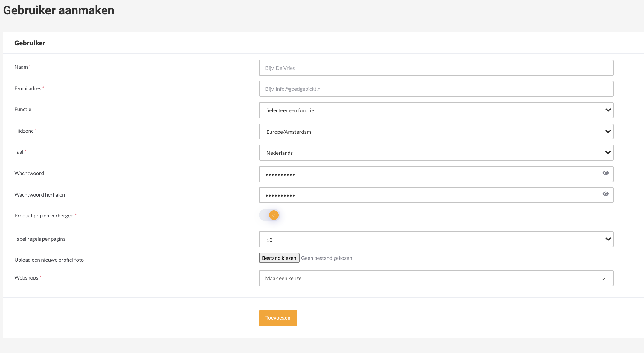 Om een nieuwe gebruiker aan te maken klik je op de oranje knop +Gebruiker aanmaken. Je komt in het volgende scherm met invulvelden. Vul de gevraagde gegevens in.