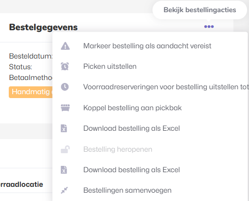 - Ga naar de bestellingacties. Deze vind je door op de 3 puntjes naar de kop Bestelgegevens te klikken.