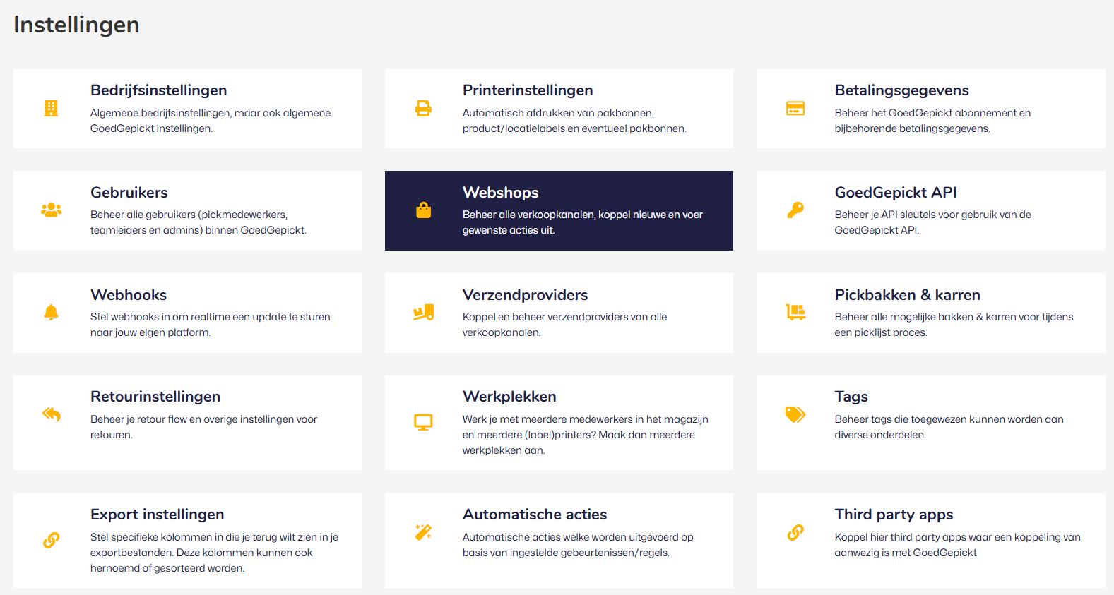- Navigeer in GoedGepickt naar Instellingen en kies hier voor Webshops.