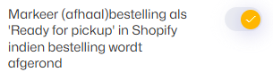 - Zet de instelling Markeer (afhaal)bestelling als 'Ready for pickup' in Shopify indien bestelling wordt afgerond aan.