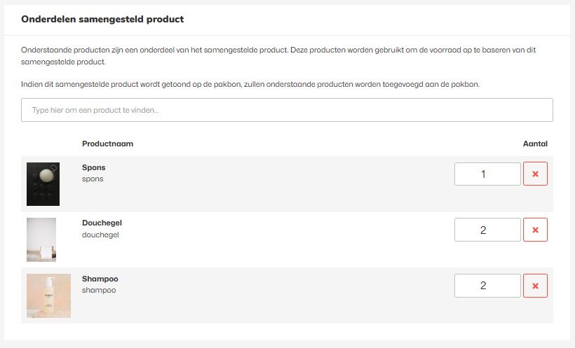 Het is mogelijk om de onderdelen van een samengesteld product aan te passen. Dit kun je handmatig of in bulk middels een Excel import aanpassen.