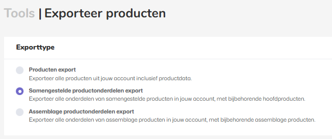 - Kies bij Exporttype voor Samengestelde productonderdelen export en vul eventueel nog andere filters naar wens in. Exporteer de producten.
