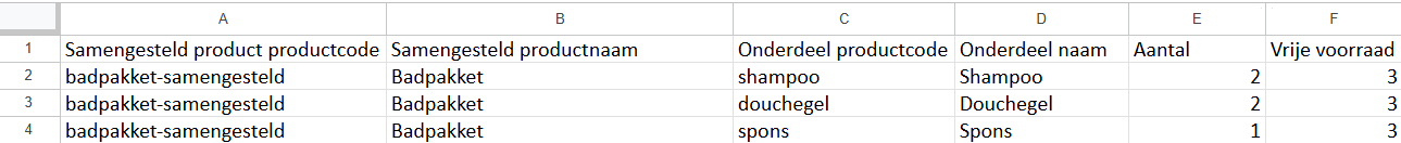 - Pas het bestand naar wens aan. Voor elk onderdeel gebruik je een aparte regel in het bestand. In onderstaand voorbeeld zie je 1 samengesteld product, met 3 onderdelen waarvan er 2 dubbel worden toegevoegd per samengesteld product:
