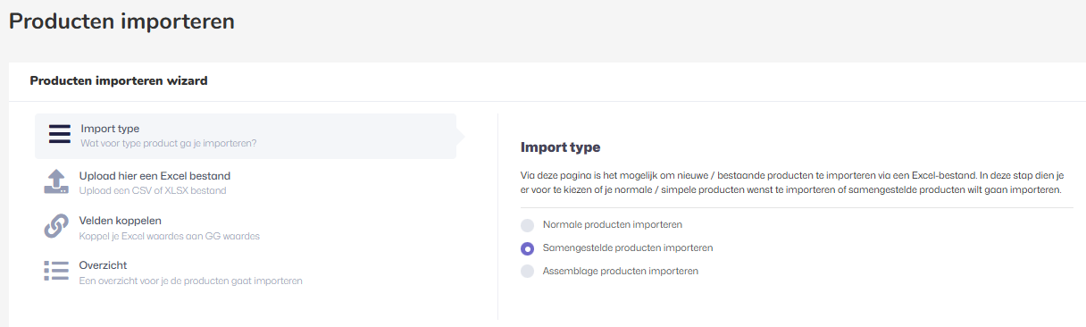 - Kies voor import type Samengestelde producten importeren en druk op Volgende.