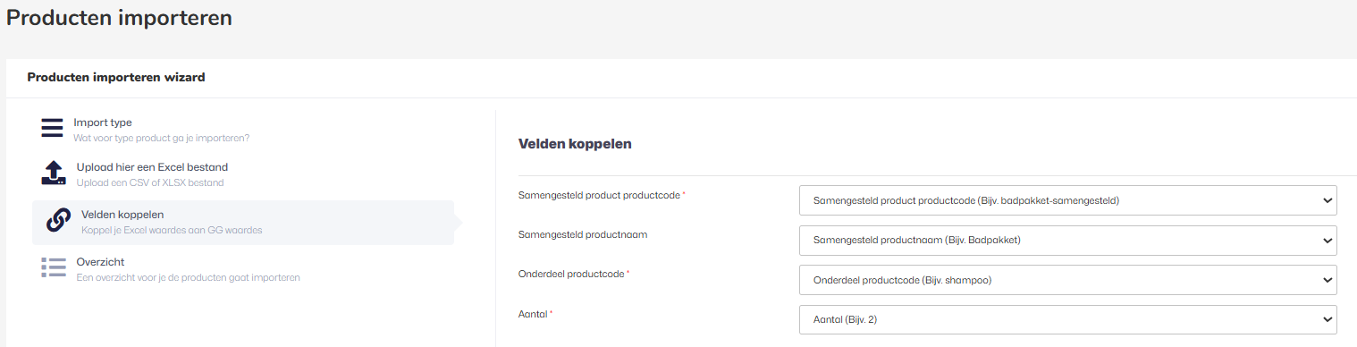 Het is ook mogelijk om de onderdelen van meerdere samengestelde producten tegelijk aan te passen middels een Excel import. We raden hiervoor aan om eerst een samengestelde producten export te maken, zodat je in dit Excel de aanpassingen kunt doorvoeren. Het is echter ook mogelijk om een eigen Excelbestand te gebruiken. Als je dit laatste wilt, volg dan onderstaande stappen vanaf stap 4: