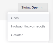Je kunt de status van een ticket wijzigen door in het ticket zelf rechtsbovenin het scherm op de huidige status te klikken en hier een andere status te selecteren.