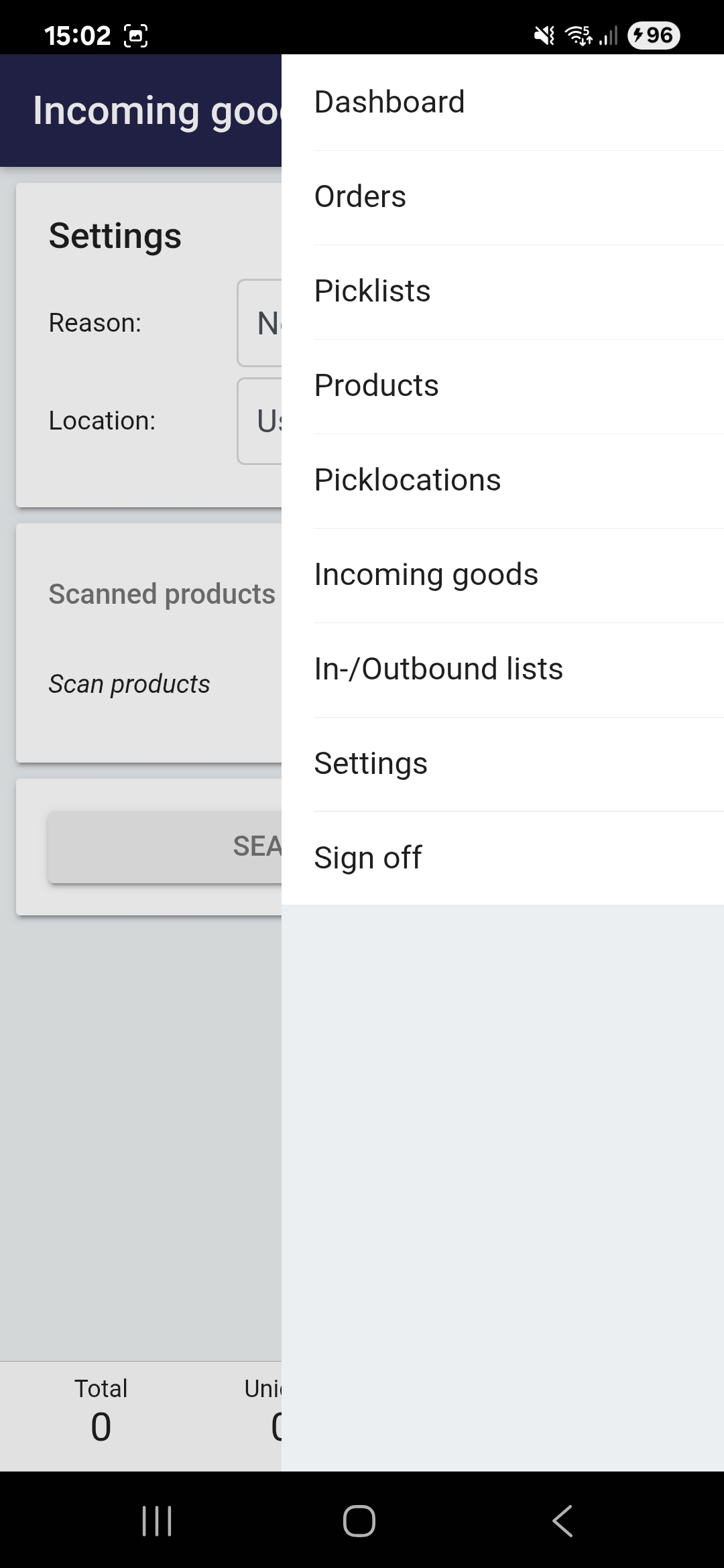 Wanneer je in de app in het menu op Incoming goods klikt, dan kom je bij het scherm om de inkomende producten te gaan verwerken.