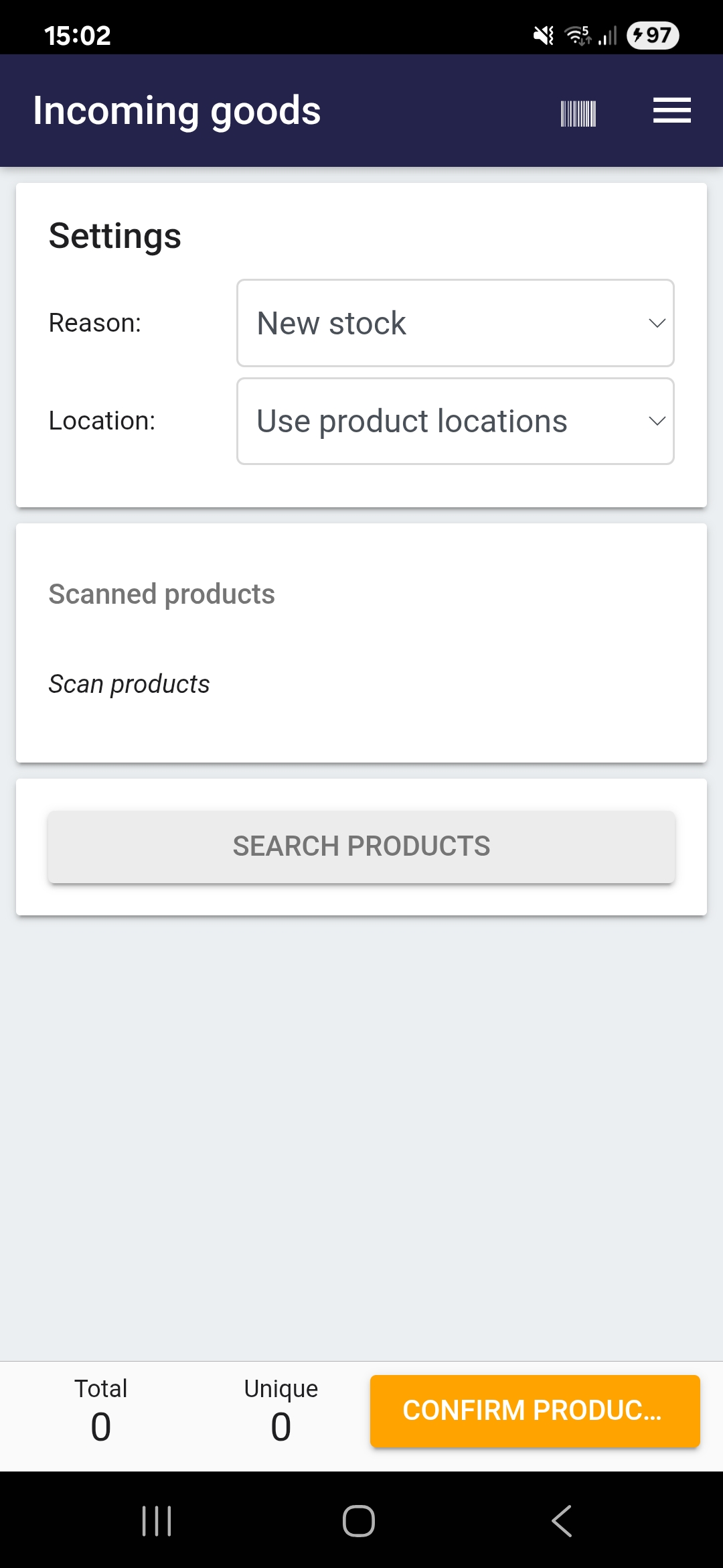 Je kunt direct je producten gaan scannen, of je drukt op de knop Search products om handmatig producten op te zoeken. Klik na het scannen of zoeken van alle nieuwe voorraad op Confirm products om naar de inruimlijst te gaan.