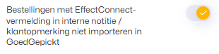 - Zet de instelling Bestellingen met EffectConnect-vermelding in interne notitie / klantopmerking niet importeren in GoedGepickt aan.